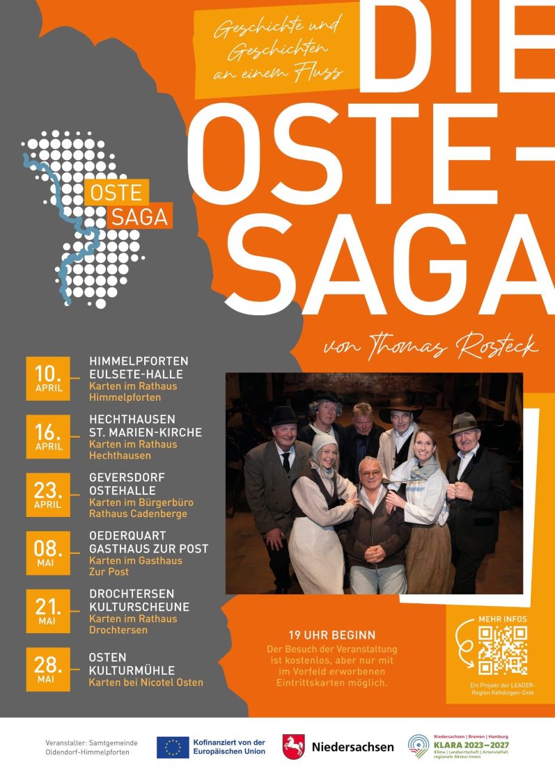 Fluten und Flutopfer, Fähren, Landwirtschaft, Schifffahrt, Walfang und die Geschichte der Anna aus Blumenthal finden sich u.a. in der Oste-Saga wieder, illustriert anhand von Filmen und ganz persönlich beleuchtet aus der Sicht historischer Persönlichkeiten, die an der Oste gelebt und gewirkt haben. So werden der Amtmann Ernst-Friedrich Pflueg aus Himmelpforten, der Gräpeler Reedereigründer Klaus Wilhelm tom Wörden, der Kaufmann Johann Thumann aus Geversdorf, der Hechthausener Gutsherr Max von Marschalck und Anna Meyer aus Blumenthal und ihr Henker Christian Schwarz leibhaftig auf der Bühne Rede und Antwort stehen.